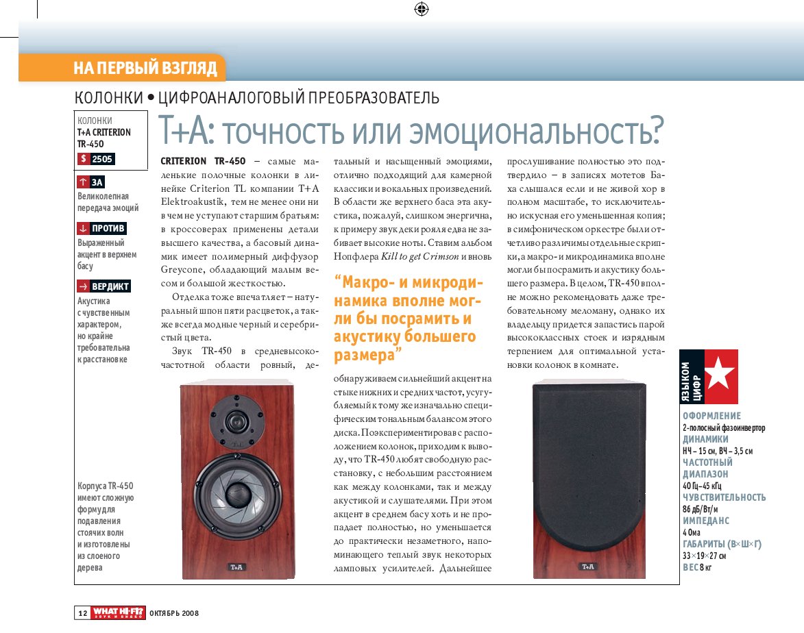 16.10.2008 Тест АС T+A Criterion TR 450 – «What Hi-Fi? Звук и Видео», октябрь 2008